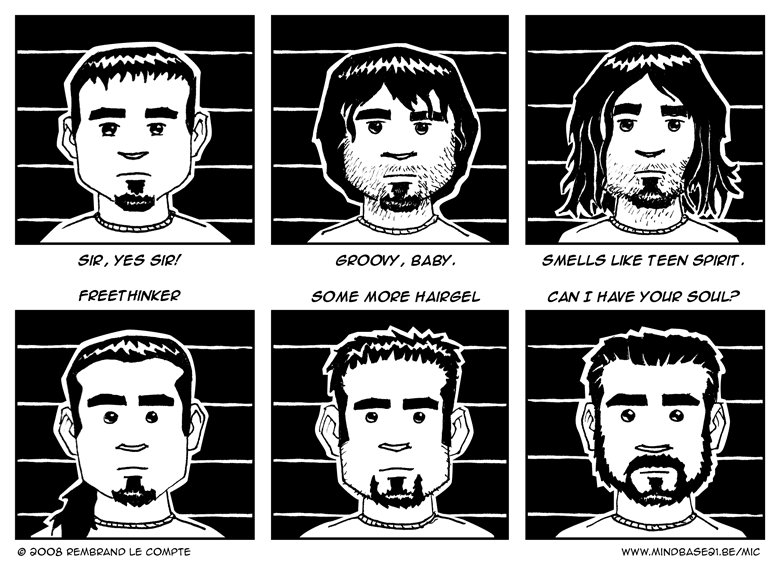 Mugshots. No, actually, these are based on various id-pictures taken through the years. Funny stuff. I’m tempted to scan a whole bunch of them. Maybe by the next update.Look here. I’m missing some essential shots, unfortunately. Like the mullet. Embrassing stuff none the less. The last one is from last week, taken with my iSight.