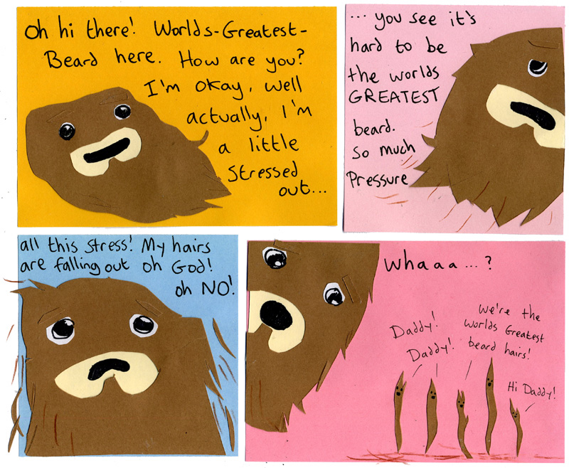 This week’s guestcomic offers a look into the everyday life of The Greatest Beard. It comes from Philippa Rice of My Cardboard Life fame. As you can see, her comics are quite different from most. No pencils or inks here. Instead each comic is carefully handcrafted out of paper, cardboard and wittiness.