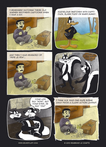 This one’s not really meant to be ‘Ha ha’ funny, so I’m curious about the reaction I’ll get. Here below, I wrote a bit of an essay explaining my thoughts. You’re welcome to skip it if you want. 😀 Disclaimer: for drawing the cartoon characters in the 2nd and 5th panels, I pretty much copied from real WB cartoon frames. …