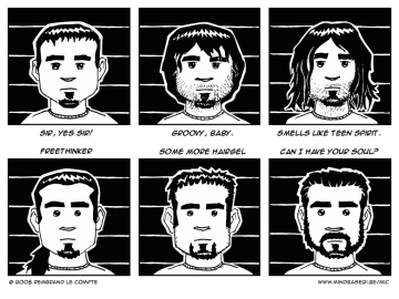 Mugshots. No, actually, these are based on various id-pictures taken through the years. Funny stuff. I’m tempted to scan a whole bunch of them. Maybe by the next update.Look here. I’m missing some essential shots, unfortunately. Like the mullet. Embrassing stuff none the less. The last one is from last week, taken with my iSight. I’m thinking about making a …