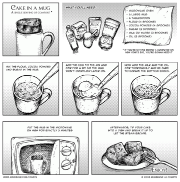 Not really a comic, but fun nonetheless. A classic receipe for cake, originally found on Wired and Vault9 but I modified it a little. Perhaps I should add a few tips as well: don’t cook it for longer than the 3 minutes and if you like experimenting, try different ingredients and shapes for the mug.