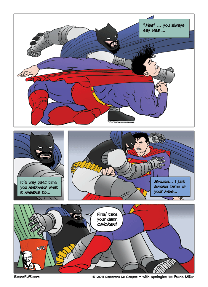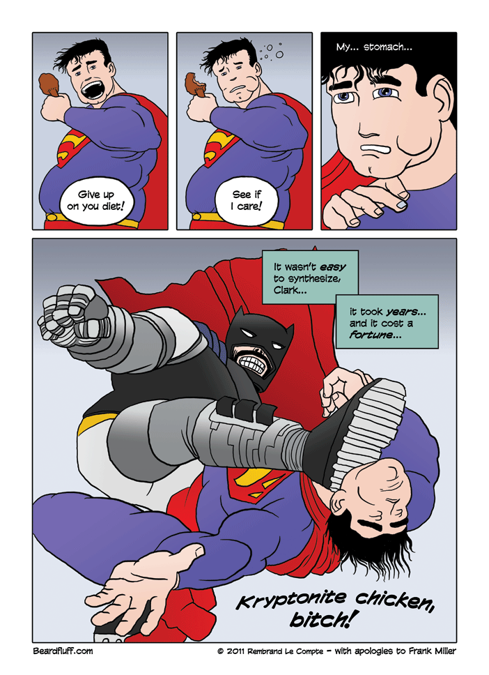 This is probably the most absurd comic I’ve made so far. If you know Frank Miller’s work on Batman, you might notice I just lifted the panels from “The Dark Knight Returns” (Sorry mr. Miller). It’s the ultimate showdown between Batman and Superman. Or in this case, Bearded Batman and Fat Superman.