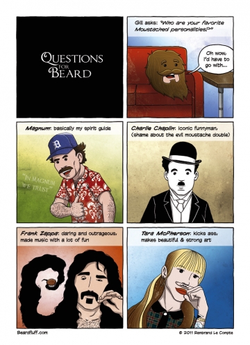 That’s right, time for another question for Beard. Remember, you can always ask your own questions on the Beardfluff Formspring or on Twitter. Against my better judgement, I’ve given Beard full control of the Beardfluff Twitter account. How do you like his new look, by the way? Is he rocking that moustache or what? A small note about the comic: …